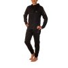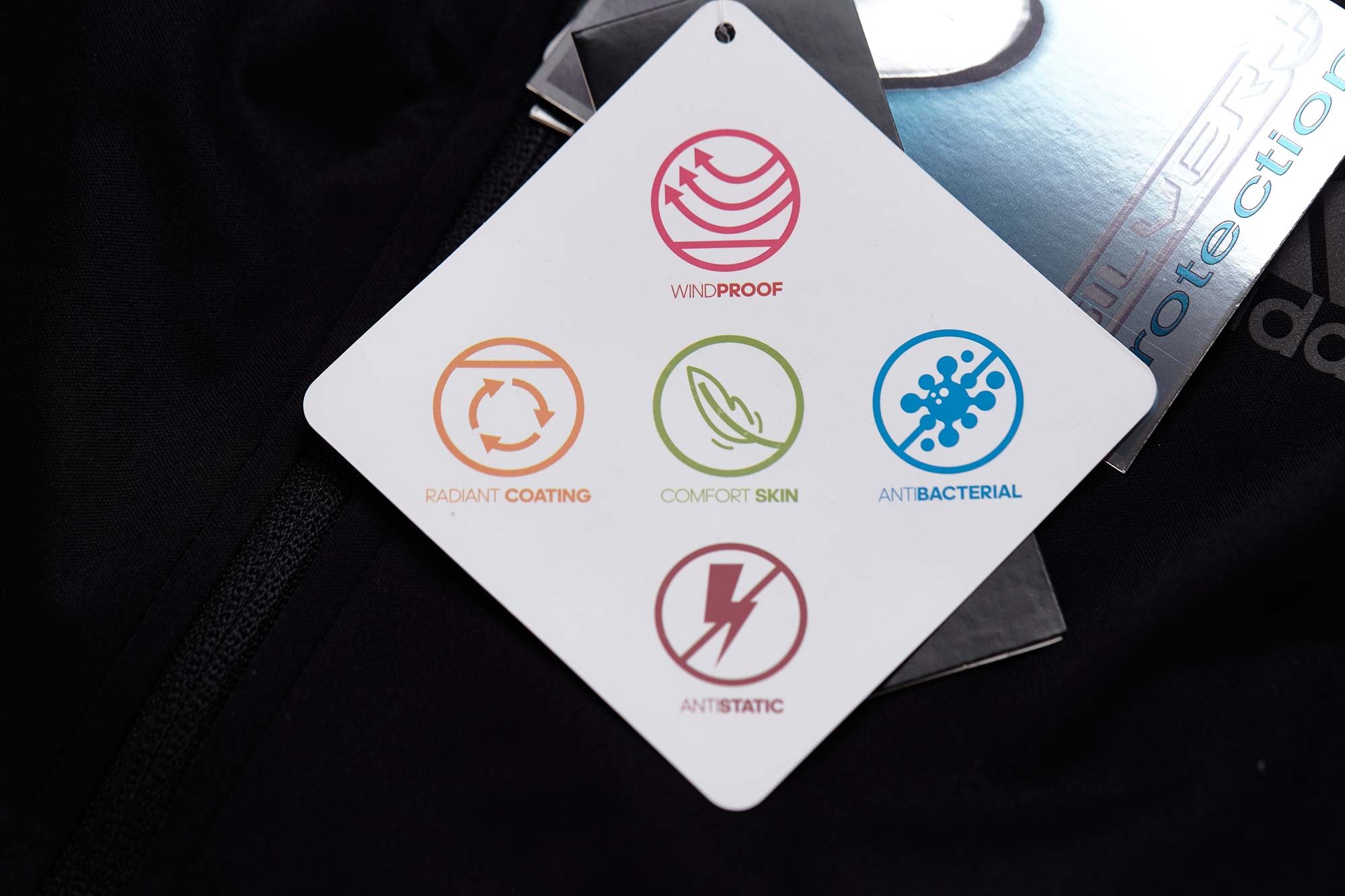 Jaket dengan resleting, tudung dengan karet pinggang elastis, manset di lengan dan kaki, reflektor di lengan atas, dada dan paha, dua saku samping di jaket dan celana